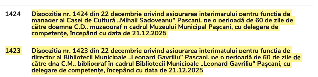 Și mandatele directorilor interimari de la Casa Municipală de Cultură „Mihail Sadoveanu” și de la Biblioteca Municipală „Leonard Gavriliu” Pașcani au fost prelungite de edil cu două luni de zile, începând cu data de 21 decembrie a.c.