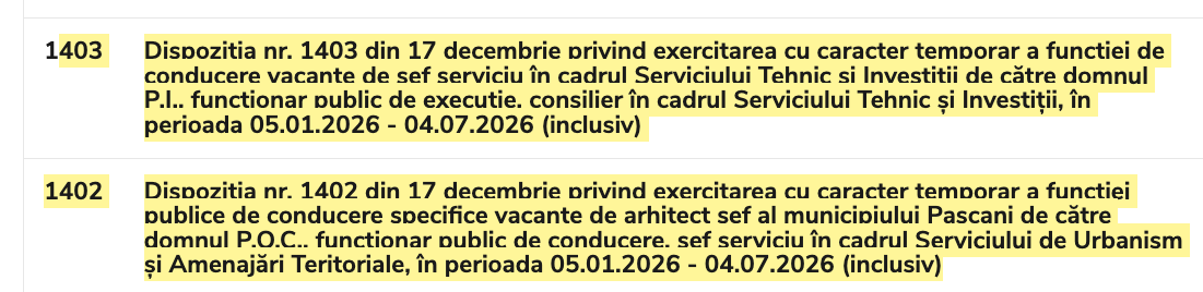 Cu câteva zile înainte de sfârșitul anului, primarul municipiului Pașcani a prelungit mandatele unor șefi de servicii și instituții din subordine. Pentru unii, cu 60 de zile, iar pentru alții, cu șase luni de zile, deși funcțiile sunt ocupate de ani de zile ca interimari. Conform dispozițiilor publicate pe site-ul instituției, Serviciul Tehnic și Investiții va fi condus și în următoarele șase luni de zile de Iulian Petru. De asemenea, mandatul arhitectului-șef Ciprian Prisecaru, la conducerea Serviciului de Urbanism și Amenajări Teritoriale, a fost prelungit tot cu șase luni de zile.