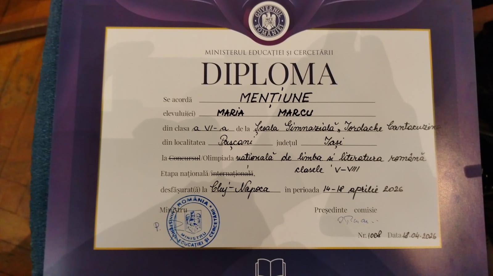 În perioada 14-18 aprilie 2026, MARIA MARCU, elevă în clasa a VI-a A, a participat la etapa națională a Olimpiadei de limba și literatura română, un eveniment al excelenței, care s-a desfășurat la Cluj-Napoca.