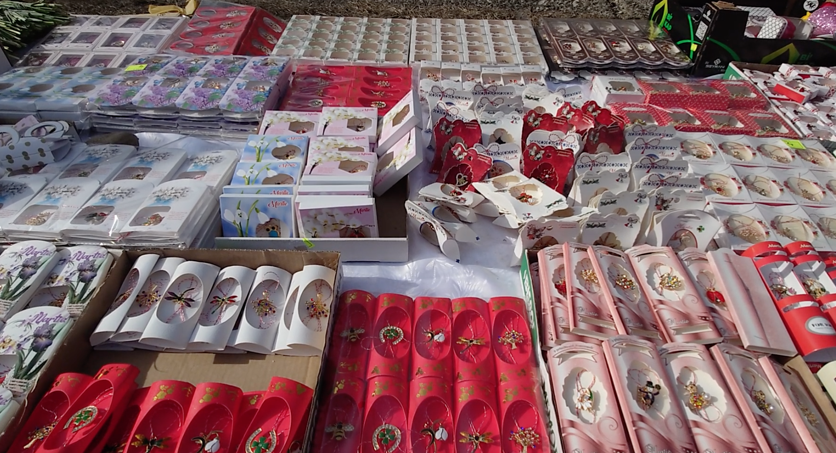 Sunt pline cu broșe colorate, tot felul de aranjamente tematice, flori, fire de ață împletite cu roșu și alb sau brățări. Oferta generoasă nu mai atrage, la fel ca în ceilalți ani. Vânzările sunt tot mai slabe de la an la an se plâng comercianții. Motivul: tradiția este pe cale de dispariție. Prețurile pornesc de la 2-3 lei.