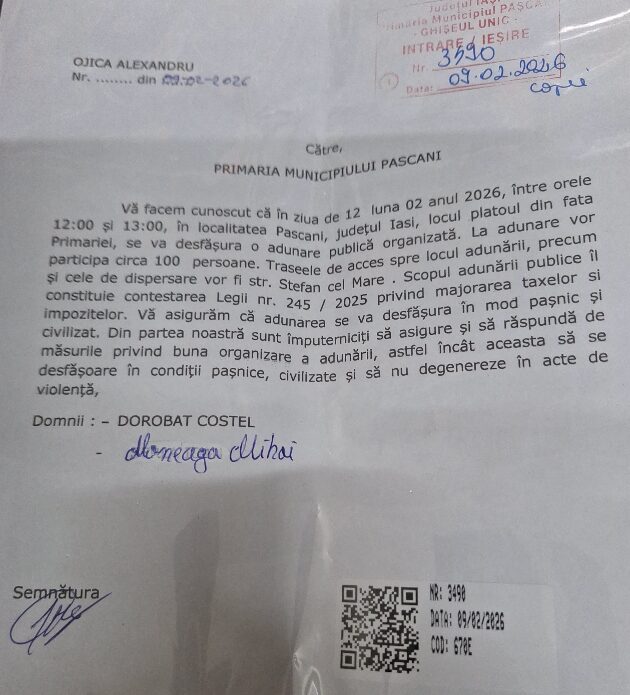 Reacțiile publice de nemulțumire după majorarea taxelor și impozitelor locale iau amploare în tot mai multe localități din țară. La Pașcani a fost anunțat un protest cu cel puțin 100 de participanți, după ce săptămâna trecută un grup de 50 de persoane a semnat și a depus la Primărie o cerere prealabilă de anulare a hotărârii aprobate de consilierii locali la sfârșitul anului trecut. Evenimentul este programat pe 12 februarie, între orele 12:00 și 13:00, pe platoul din fața Primăriei. Instituția a fost deja înștiințată.