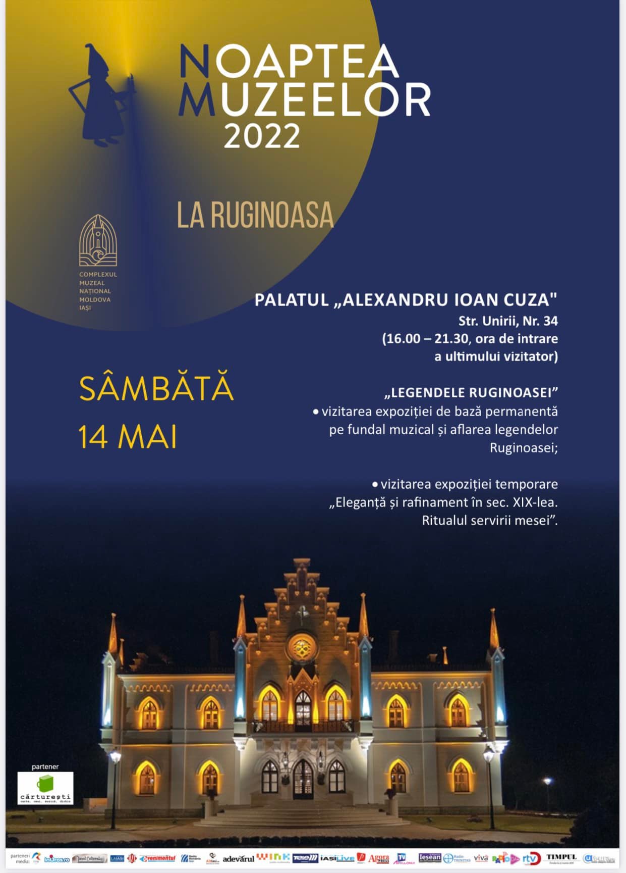 La sfârșitul acestei săptămâni va avea loc o nouă ediție a evenimentului „Noaptea Muzeelor”, mai exact, sâmbătă, 14 mai. Cei care vor să viziteze la ceas de seară, palatul domnitorului Al.I. Cuza din Ruginoasa, o pot face între orele 16:00 – 21:30, ora de intrare a ultimului vizitator. Totodată, în timp ce vor vizita expoziția de bază permanentă pe fundal muzical, vor afla despre legendele Ruginoasei.