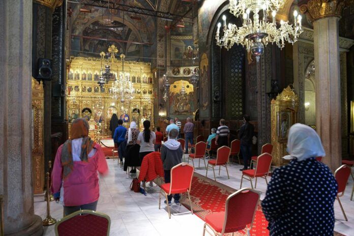 1. Sfânta Liturghie şi celelalte slujbe liturgice din timpul săptămânii, din duminici şi sărbători se săvârşesc în interiorul bisericii, accesul realizându-se în așa fel încât între credincioși să fie o distanță de 2 m în orice direcție (4 mp pentru fiecare credincios). Dacă numărul credincioşilor este mai mare decât spațiul interior disponibil, ceilalți credincioşi vor asculta slujba stând în exteriorul bisericii, slujba fiind transmisă la difuzoare sau clericii vor săvârşi slujba în aer liber (în curtea bisericii).