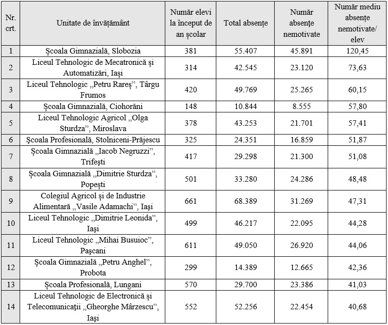 „Ziarul de Iași” a solicitat Inspectoratului Școlar Județean (ISJ) Iași o statistică privind școlile cu cel mai mare număr de absențe nemotivate în anul școlar 2024-2025. Datele arată că, într-un clasament al primelor 14 unități de învățământ realizat în funcție de numărul mediu de absențe nemotivate per elev, valorile variază între 120,45 – cea mai mare medie – și 40,68, cea mai mică.