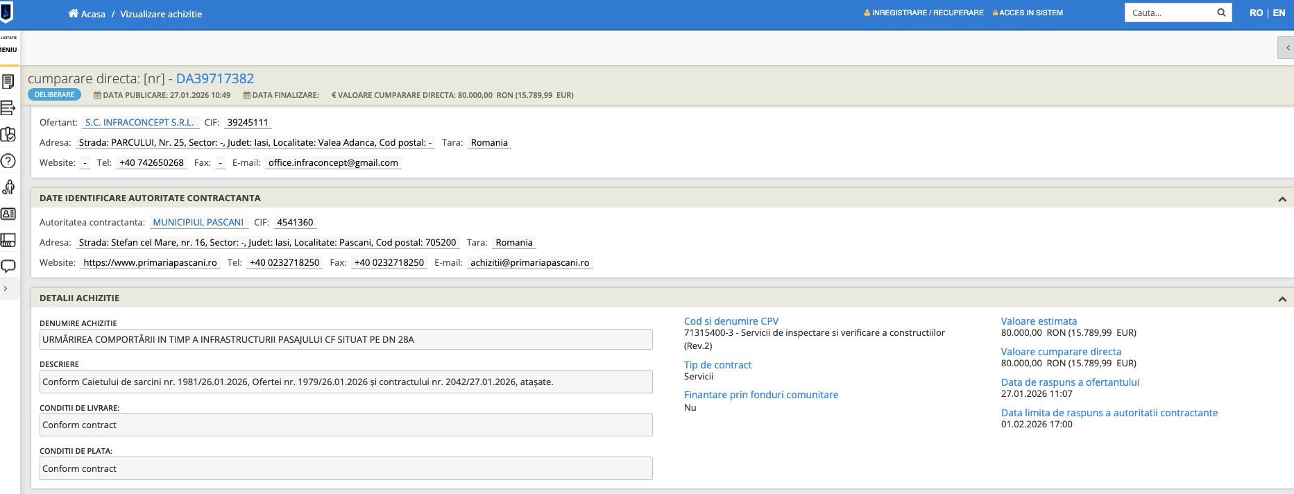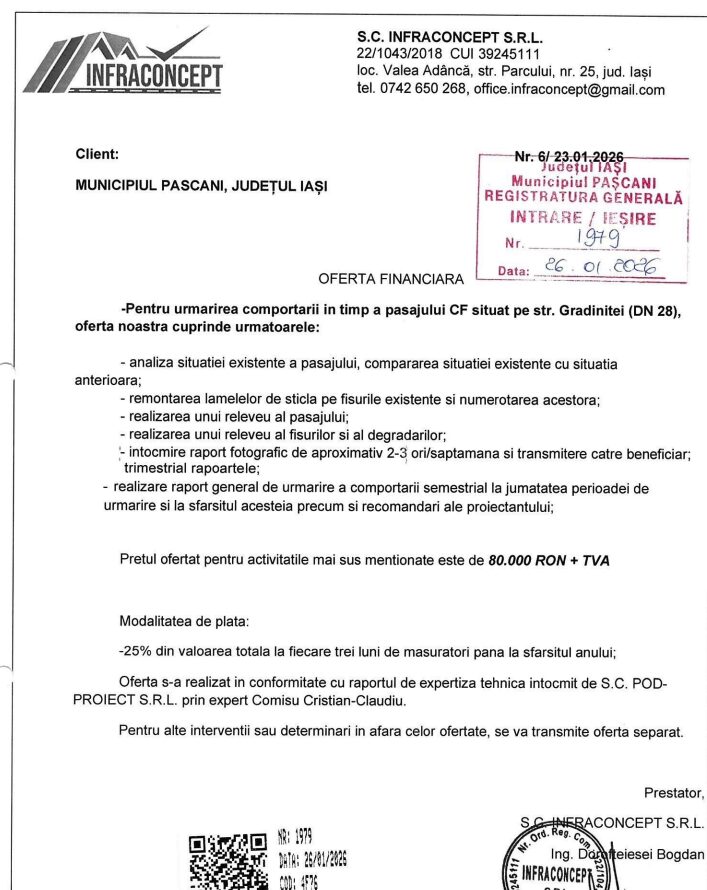 Termenul-limită a fost depășit, podul este la fel, iar până acum nu au fost făcute lucrări de reparații sau consolidare. În schimb, administrația locală achită în fiecare an sume importante de bani pentru monitorizarea podului. Ultima achiziție a serviciilor este de acum câteva zile, pentru anul 2026. Valoarea contractului este de 80.000 lei fără TVA. De acești bani este montat un dispozitiv pe structura de susținere a podului, iar periodic se fac verificări cu privire la gradul de degradare.