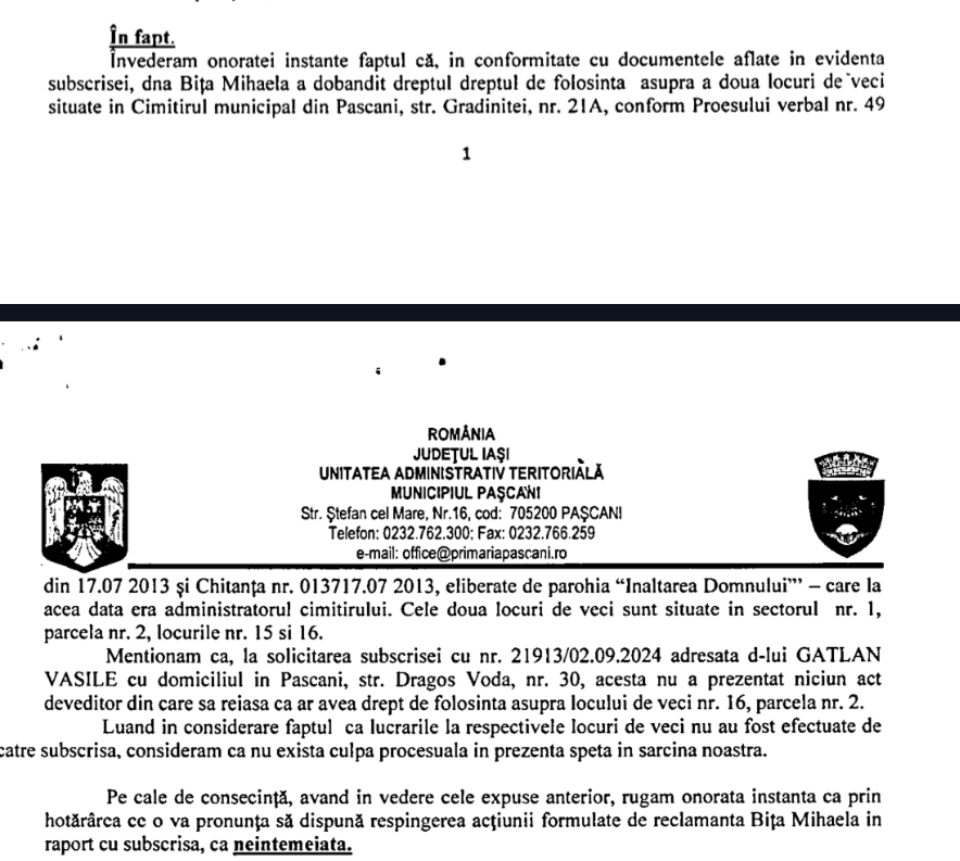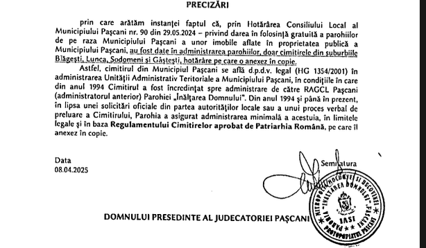 Situația este confirmată și de reprezentanții „Parohiei Înălțarea Domnului”. Din răspunsul depus la dosar reiese că cimitirul municipal este deținut cu acte în regulă de Primăria Pașcani, din anul 1994 și că Parohia doar a asigurat, până de curând, administrarea minimală a acestuia.