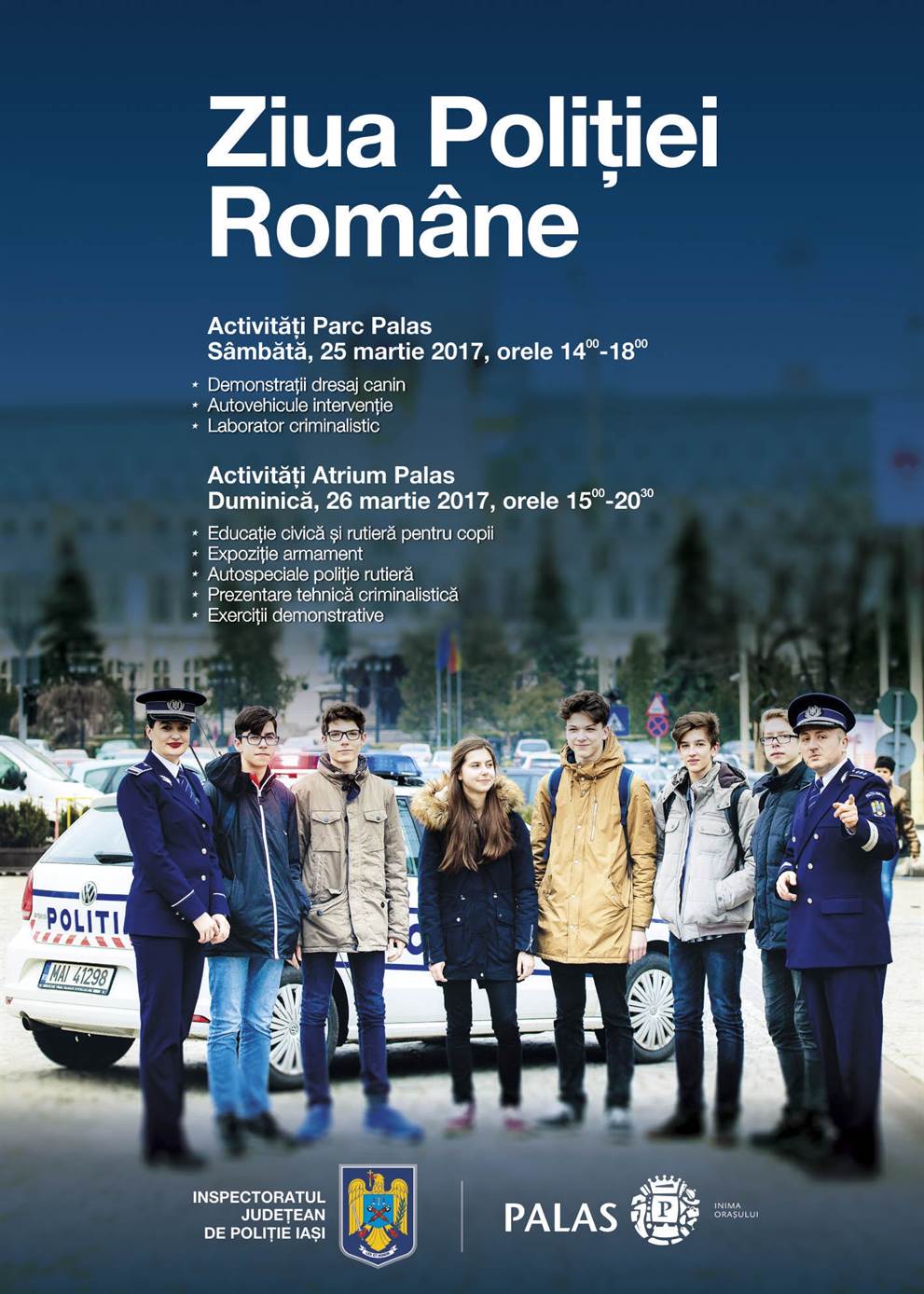 La data de 25 martie a.c. (în intervalul orar 14.00 – 18.00) – în Parcul Palas Mall şi 26 martie (în intervalul orar 15.00 – 20.00) – în Atrium Palas Mall, Inspectoratulde Poliţie Judeţean Iaşi desfăşoară campania „Ziua Poliţiei Române”.