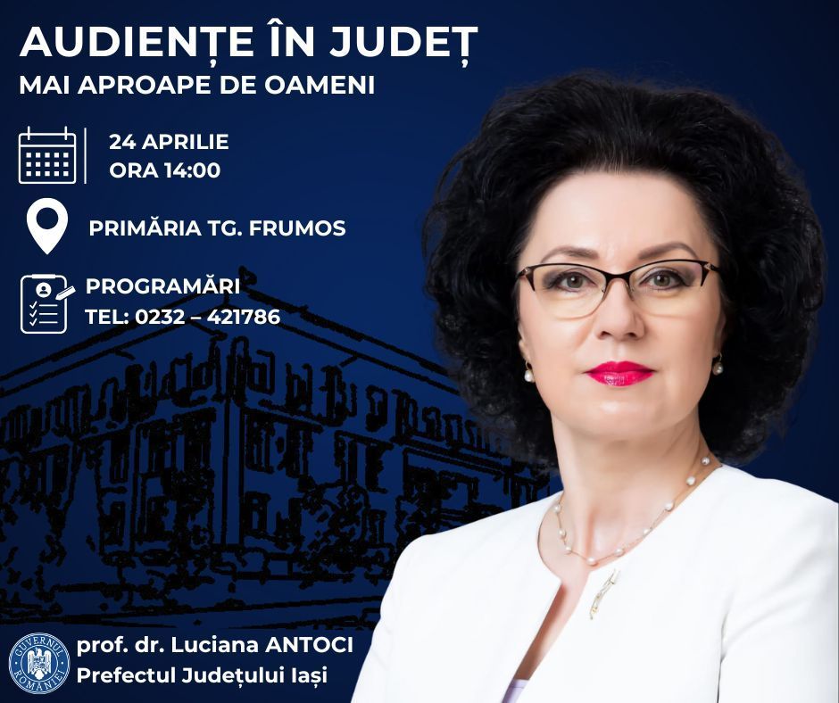 O nouă sesiune de audiențe în teritoriu a prefectului județului Iași, Luciana Antoci. De această dată, la Primăria Târgu Frumos. Ziua de audiențe este programată după sărbătorile pascale, mai exact, pe 24 aprilie, de la ora 14:00.