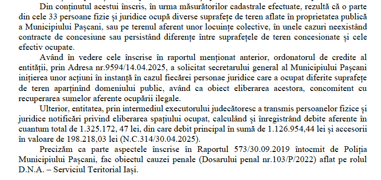 Menționăm că, din anul 2020 și până în aprilie 2025, primarul Marius Pintilie nu a făcut nimic pentru recuperarea prejudiciilor și a suprafețelor de teren ocupate în mod abuziv. Abia în aprilie 2025, edilul îi solicită, printr-o adresă, secretarului general al primăriei: