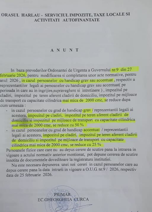 Conform anunțului publicat pe site-ul instituției publice Hârlău de către Serviciul Impozite, Taxe locale și Activități Autofinanțate în data de 05.03.2026, în aplicarea OUG nr. 9/27.02.2026 a fost anunțat faptul că, pentru anul 2026 în cazul persoanelor cu handicap grav sau accentuat, respectiv a reprezentanților legali ai persoanelor cu handicap grav sau accentuat (pe perioada în care au în îngrijire, supraveghere și întreținere persoana cu handicap), impozitul pe clădiri, impozitul pe teren aferent clădirii de domiciliu, impozitul pe mijloacele de transport cu capacitate cilindrică mai mică de 2000 cmc, se reduce după cum urmează: