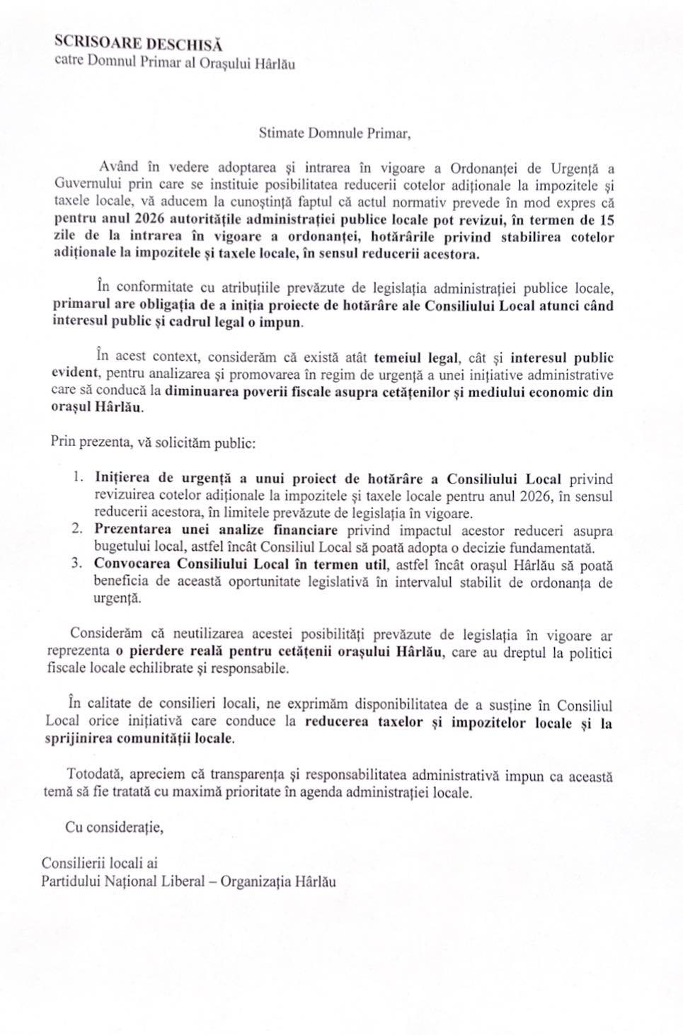 Având în vedere Scrisoarea deschisă adresată Primarului orașului Hârlău de consilierii locali ai Partidului Național Liberal – Organizația Hârlău din data de 11 martie 2026 prin care se solicită o serie de demersuri legale referitoare la inițierea unui proiect de hotărâre pentru ”revizuirea cotelor adiționale la impozitele și taxele locale pentru anul 2026, în sensul reducerii acestora în limitele prevăzute de legislația în vigoare” vă aducem la cunoștință următoarele aspecte legale: