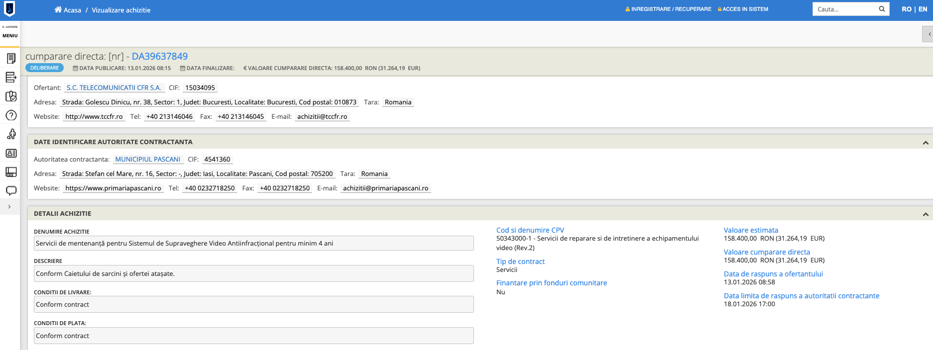 Primele achiziții publice din acest an la Primăria Pașcani. Municipalitatea va cheltui aproape 190 000 (158 400 lei fără TVA) pentru mentenanță unor sisteme de supraveghere video din municipiu. Conform anunțului ar fi vorba de 59 de camere video de înregistrare care formează „Sistemul de supraveghere video anti-infracțional amplasate in diferite locații ale municipiului si la sediul Poliției Locale. Contractul va fi pentru patru ani de zile iar serviciile vor fi prestate de o societate din Bucuresti, Telecomunicații CFR SA. Serviciile au fost contractate prin cumpărare directă, nu licitație, pe baza unei singure oferte.