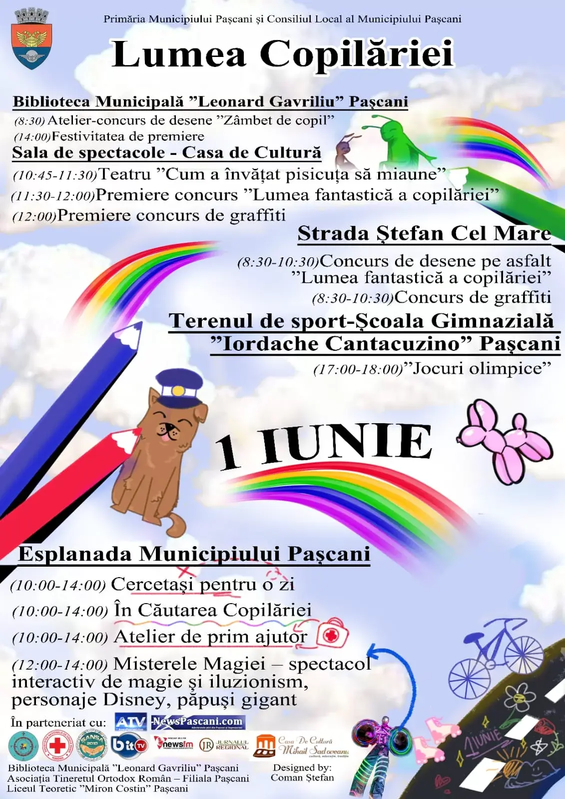 Ziua Copilului, sărbătorită pe 1 iunie, va aduce bucurie celor mici prin activitățile organizate în municipiul Pașcani. Atelier-concurs de desen, teatru, concurs de desene pe asfalt, „jocuri olimpice”, spectacol de magie si iluzionism și multe altele, vor avea loc în mai multe zone din oraș.