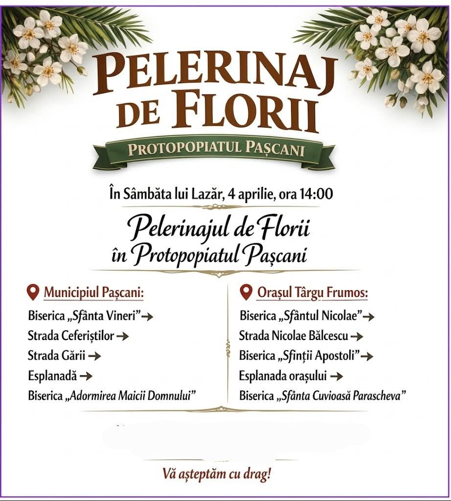 În Sâmbăta lui Lazăr, 4 aprilie, începând cu ora 14:00, credincioșii din Protopopiatul Pașcani sunt invitați la Pelerinajul de Florii, care se va desfășura în cele două orașe ale protopopiatului.