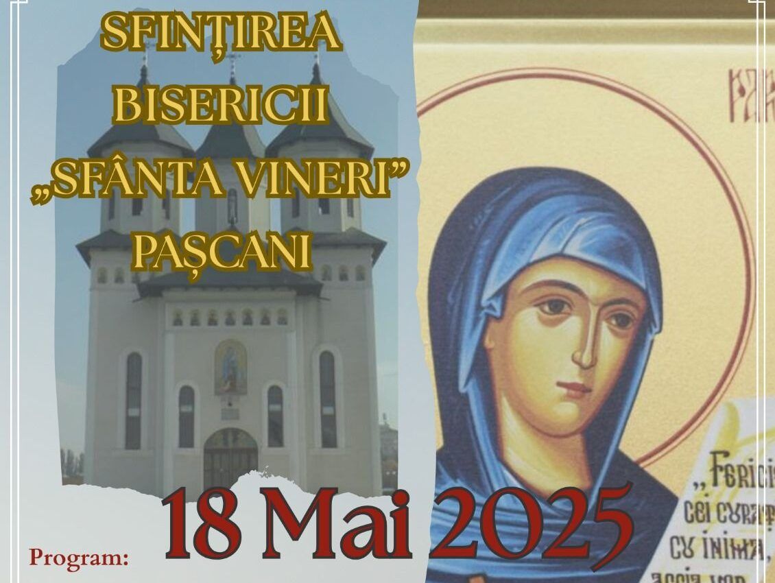 Pașcănenii și nu numai sunt așteptați duminică, 18 mai 2025, la un moment deosebit în viața comunității: sfințirea Bisericii „Sfânta Vineri” din municipiu. Evenimentul religios se va desfășura începând cu ora 07:45, la lăcașul de cult situat pe strada Ceferiștilor nr. 8, și va include mai multe momente importante, potrivit programului anunțat de organizatori.
