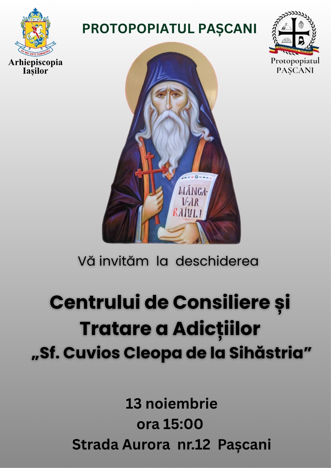 Un centru dedicat sprijinirii persoanelor care se confruntă cu dependențe va fi deschis în municipiu. Protopopiatul Pașcani, cu binecuvântarea Înaltpreasfințitului Părinte Teofan, Arhiepiscopul Iașilor și Mitropolitul Moldovei și Bucovinei, inaugurează joi, 13 noiembrie, Centrul de Consiliere și Tratare a Adicțiilor „Sfântul Cuvios Cleopa de la Sihăstria”.