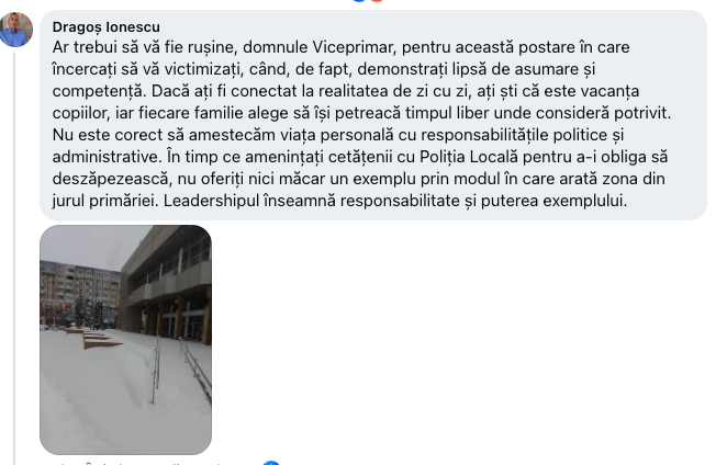 „Orașul înseamnă toate cartierele și toți cetățenii. Primarul anunță că va trimite Poliția Locală acolo unde este nevoie, pentru a „stimula” cetățenii să își facă deszăpezirea în fața caselor. Însă, în timp ce administrația nu reușește să își facă pe deplin treaba, unii pășcăneni riscă să primească amenzi „stimulente”. Respectul pentru oameni începe cu lucrurile de bază.”