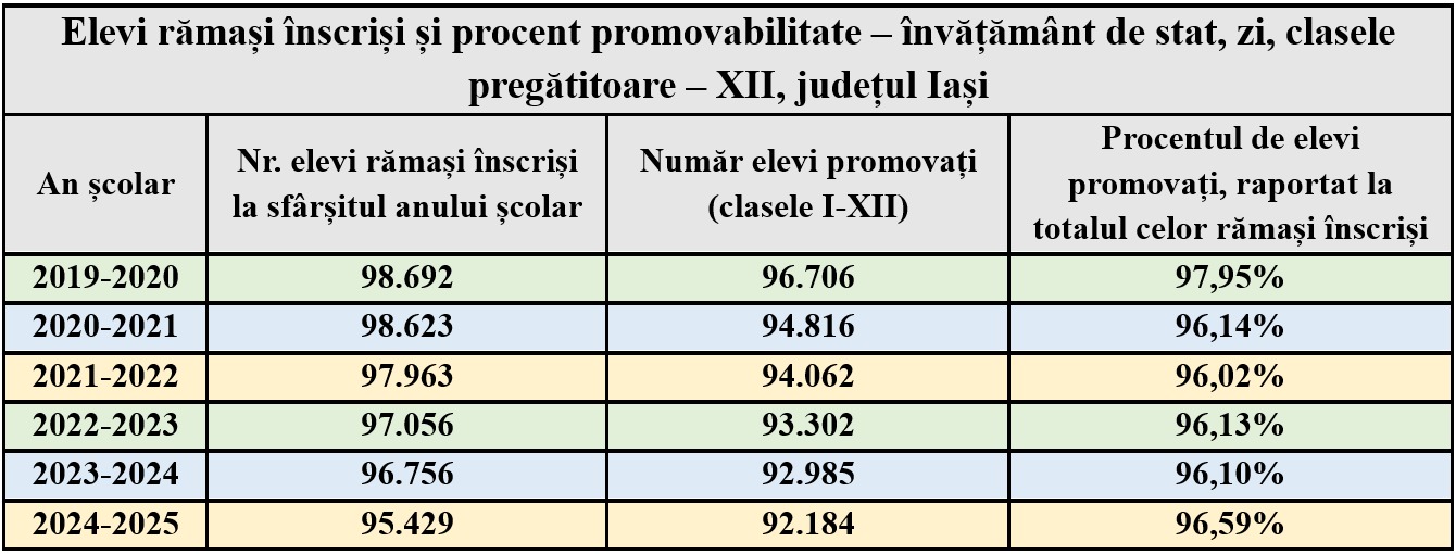 Potrivit datelor puse la dispoziție de ISJ, procentul de elevi promovați în județul Iași variază între 96,02% și 97,95% în ultimii șase ani școlari. Pragul cel mai ridicat a fost înregistrat în anul școlar 2019-2020, anul de început al pandemiei, când promovabilitatea a atins aproape 98%. După această etapă, procentul a coborât la aproximativ 96%. Ultima creștere vizibilă în ceea ce privește procentul elevilor promovați, raportat la totalul celor rămași înscriși este înregistrată în anul școlar anterior (2024-2025): 96,95%.