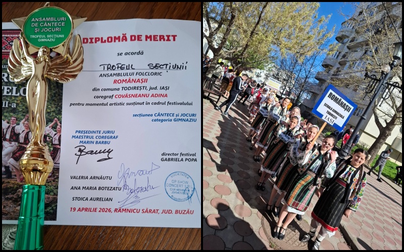 🍀TROFEUL SECȚIUNII🏆 obtinut de Amsamblul Românașii🇷🇴 al Școlii Gimnaziale nr 1 Todiresti impreună cu solista vocală cu care avem o frumoasă colaborare, Melania Topolnicianu Mioara Melania!💙💛❤️” se arată pe pagina de Facebook a Ansamblul de Dansuri Populare „Românașii”.