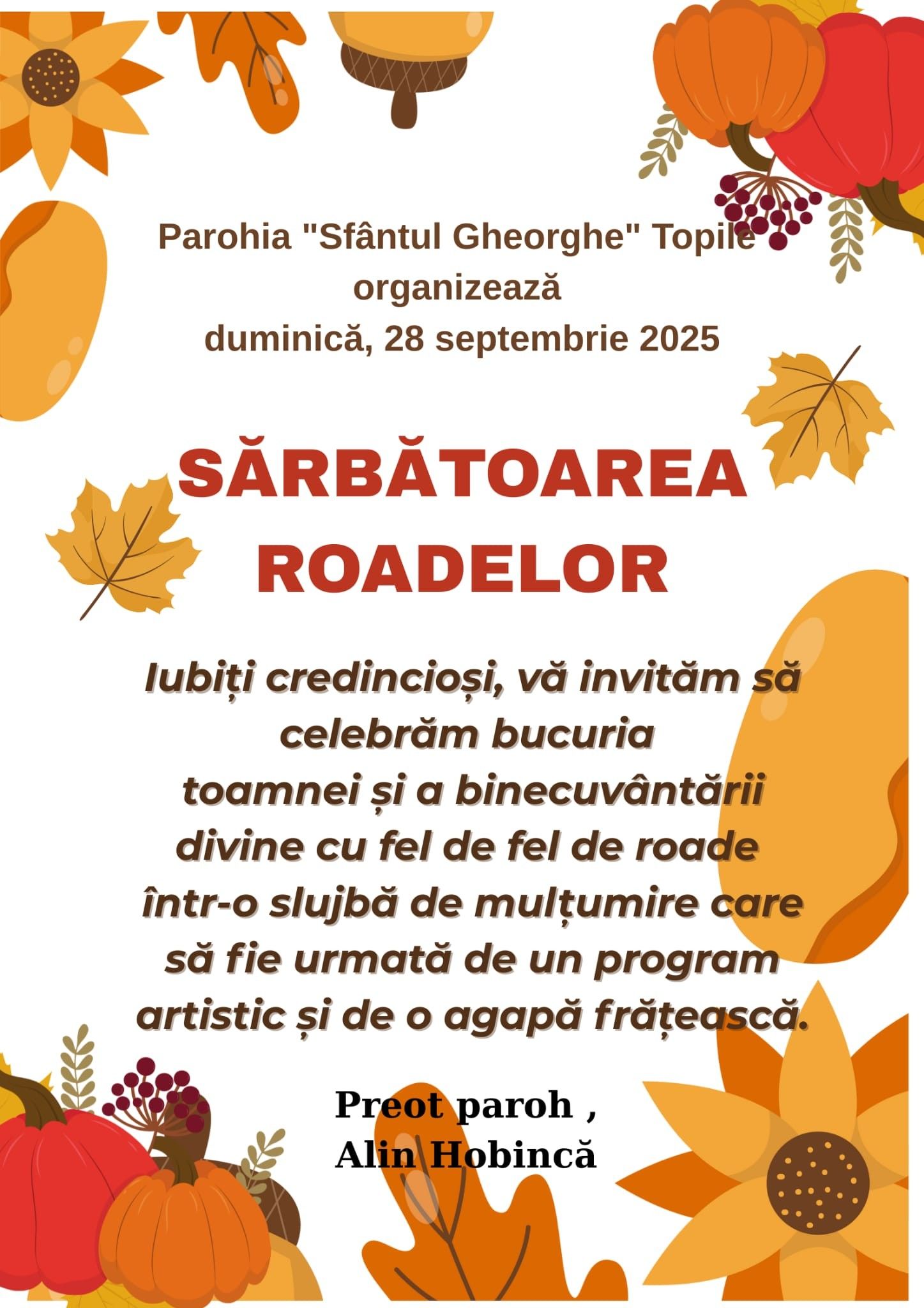 Sărbătoarea roadelor la Topile, pe final de septembrie. Evenimentul este organizat de Parohia Sfântul Gheorghe.