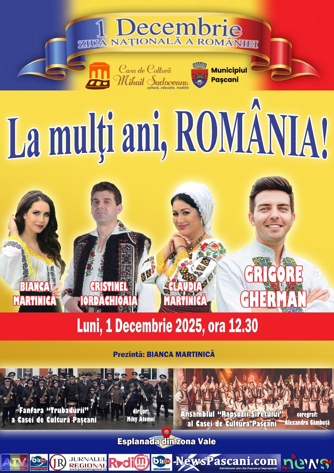 Pășcănenii, și nu numai, sunt invitați cu mic cu mare la spectacolul folcloric ce va avea loc de Ziua Națională în municipiul Pașcani. Luni, 1 decembrie 2025, de la ora 12:30, pe esplanada din zona Vale va fi marea sărbătoare.