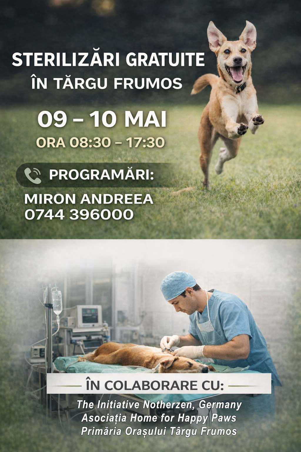 Vești bune pentru iubitorii de animale din Târgu Frumos. O campanie de sterilizări gratuite pentru câini și pisici va avea loc în luna mai, în încercarea de a reduce numărul animalelor fără stăpân din oraș.
