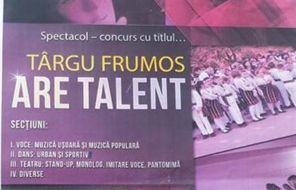 “Târgu Frumos are talent” spectacol caritabil susţinut de elevii Liceului Ion Neculce din oraş. Timp de 4 minute fiecare adolescenţii îşi vor demonstra talentele vocale, priceperea la dans şi teatru. Evenimentul artistic va avea loc joi, 21 aprilie începând cu ora 15.00 la Casa de Cultură Garabet Ibrăileanu din oraş.