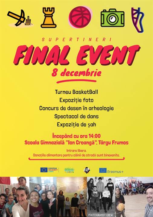 C.P. Duminică, 8 decembrie 2019, începând cu ora 14:00, Asociaţia SUPER TINERI – ASIRYS vă invită în sala de sport a Şcolii Gimnaziale „Ion Creangă” la un eveniment cultural participativ şi non-formal, pregătit de cei 5 voluntari ai asociaţiei, veniţi din Grecia, Franţa, Spania, Columbia şi Mexic, pentru perioade de 3 până la 12 luni.