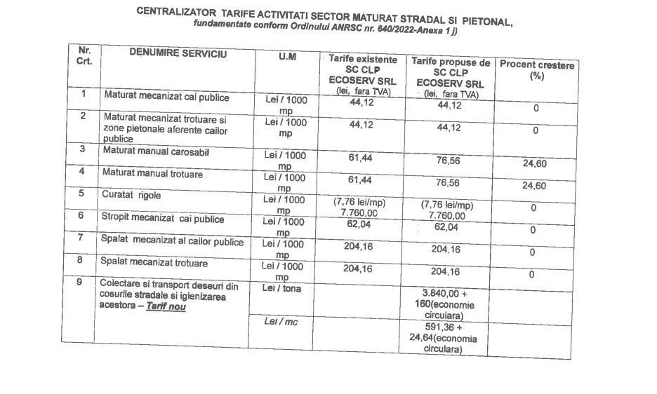 Conform proiectului, vor crește prețurile cu 24% pentru măturatul străzilor și trotuarelor și a fost introdus un serviciu separat pentru colectarea și transportul din coșurile stradale de gunoi, după cum urmează: