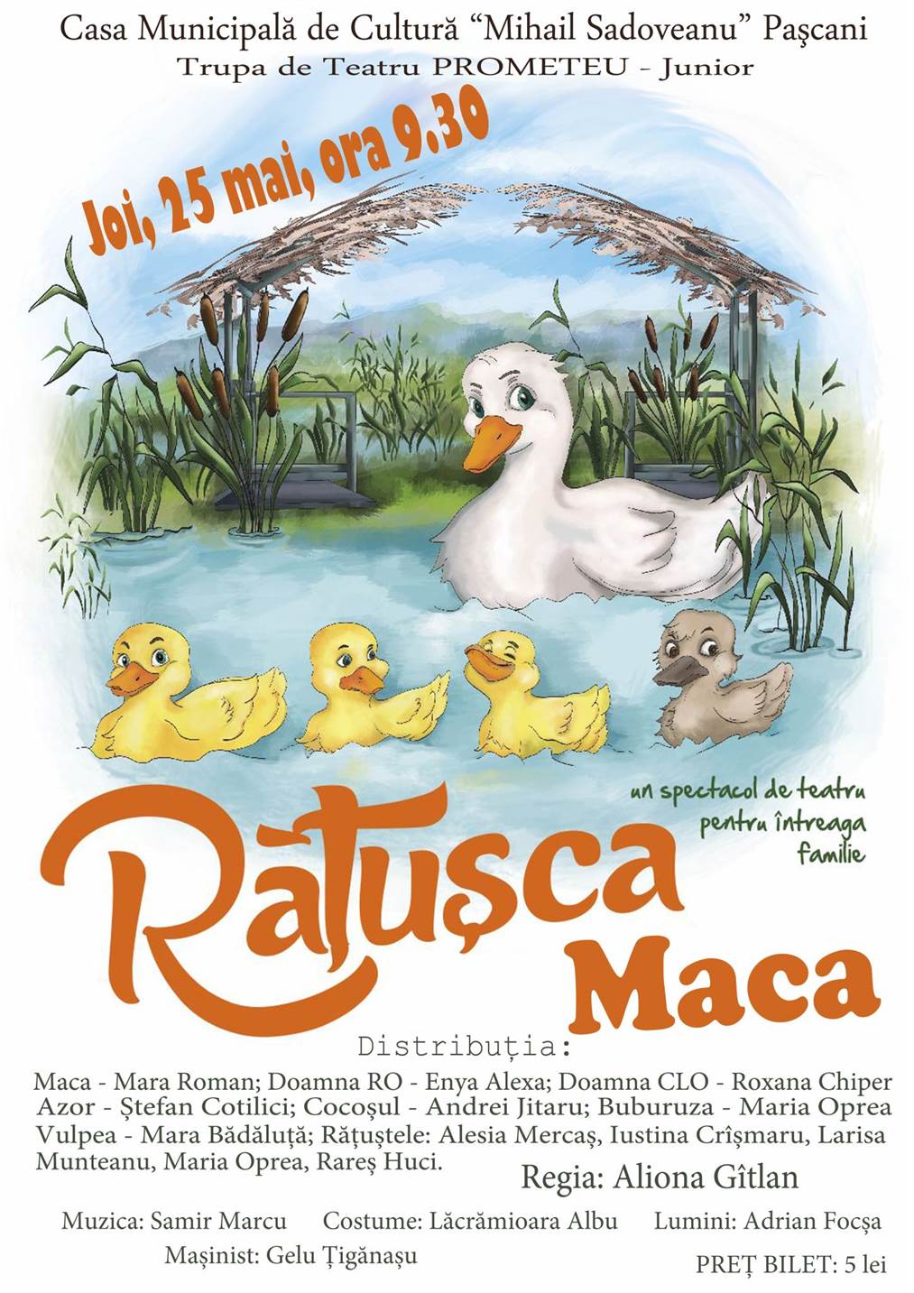 Casa de Cultura „Mihail Sadoveanu” din Pascani va invita la o piesa de teatru pentru intreaga familie. Joi, 25 mai, trupa Promoteu-junior a institutiei publice mentionate va invita la o premiera: „Ratusca Maca”. Spectacolul va incepe dimineata, de la ora 9:30, iar pretul unui bilet este de 5 lei.