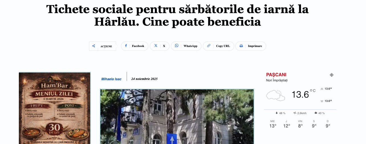 De asemenea, în municipiul Iași au fost acordate tichete sociale, iar Guvernul Bolojan, printre măsurile de protecție socială, are în vedere alocarea de tichete pentru toți pensionarii români de Crăciun și Paște, câteva sute de lei în funcție de pensie. De asemenea, Primăria orașului Hârlău alocă în fiecare an astfel de tichete. Spre exemplu, anul trecut de Crăciun, 700 de persoane au beneficiat de tichete în valoare de câte 100 de lei. Menționăm că la Pașcani ar urma să beneficieze circa 350 de persoane conform situației prezentate de Serviciul de Asistență Socială, în urma anchetelor făcute de specialiștii primăriei. Este vorba de persoane cu venituri mici, venitul minim garantat și fără alte posibilități materiale. Pentru acestea, din bugetul local ar trebui alocată suma de aproape 90.000 de lei.