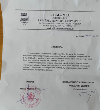 Pe de altă parte, Primăria Pașcani, proprietarul și administratorul cimitirului, nu a avut nicio reacție, deși municipalitatea trebuie să asigure paza și administrarea locului respectiv. Dintr-un document emis de Compartimentul Parcări și Cimitire reiese foarte clar că reclamantul a plătit pentru locul de veci în anul 1998 la RAGCL și că are dreptul să îl folosească.
