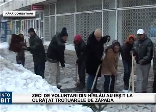Zeci de voluntari din Hirlau, au dat astazi la lopata pentru a curata cateva trotuare din oras. Ei au cerut lemne de la primarie pentru a incalzi locuintele, in schimbul acestora manifestandu-si dorinta de a curta de zapada anumite strazi si trotuare din Hirlau. Pe langa lemne, au primit si pachete cu alimente de baza, valoarea unuia fiind de pana in 100 de lei.