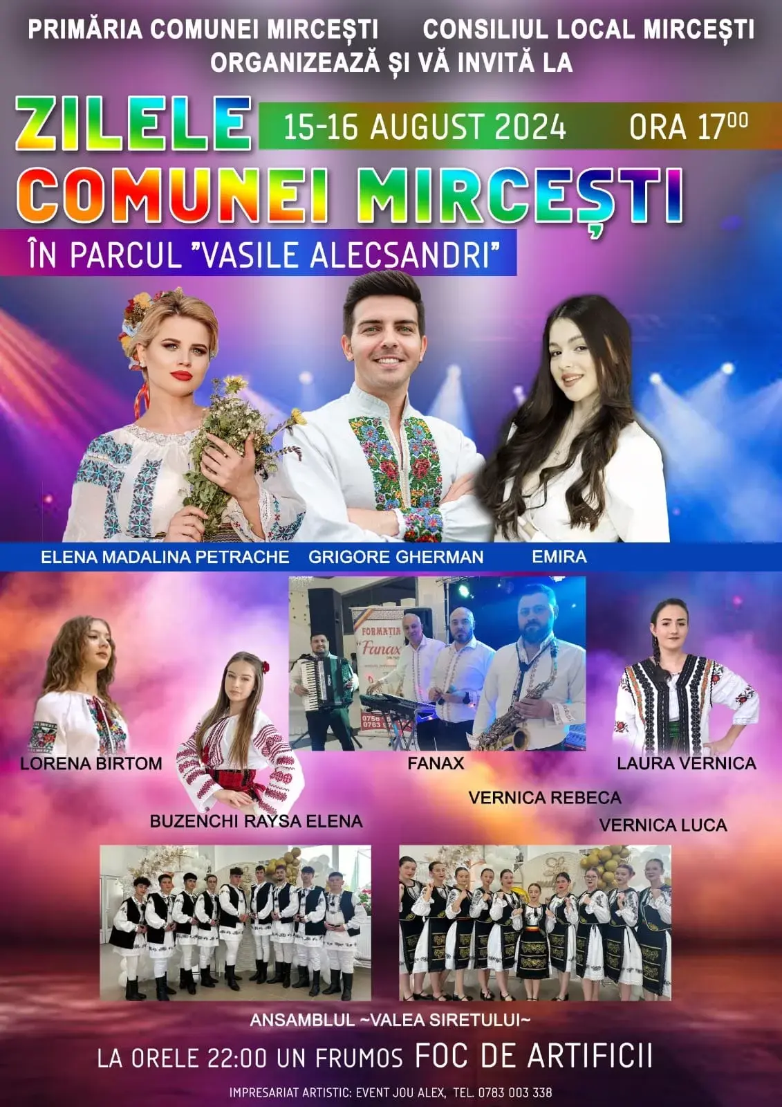 Comuna Mircești va fi în sărbătoare timp de două zile, în perioada 15-16 august. Primăria și Consiliul Local organizează Zilele Comunei, în parcul Vasile Alecsandri. Printre invitații acestei ediții, se numără Grigore Gherman, Elena Madalina Petrache sau Emira.