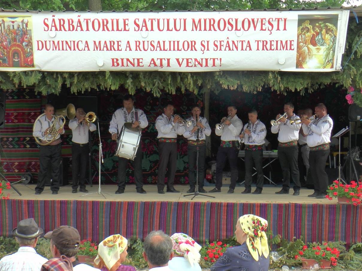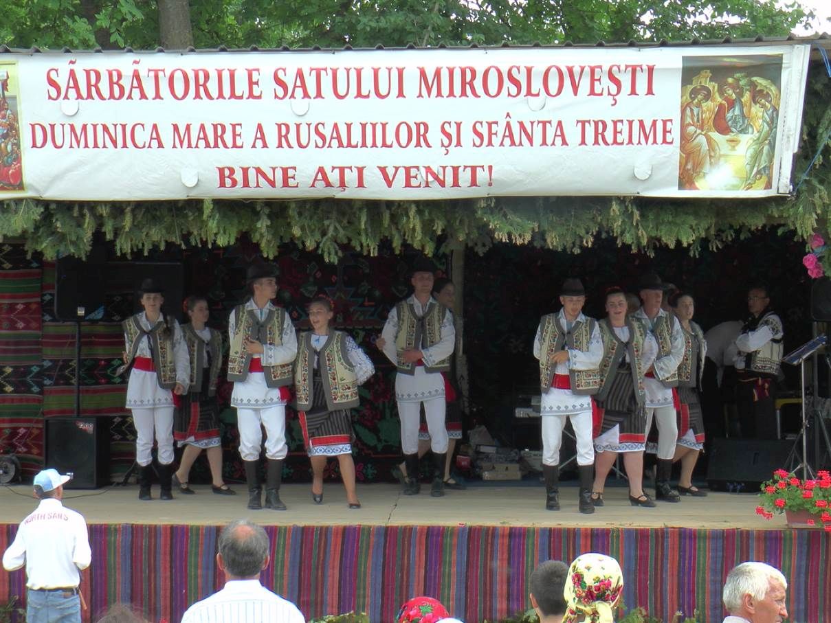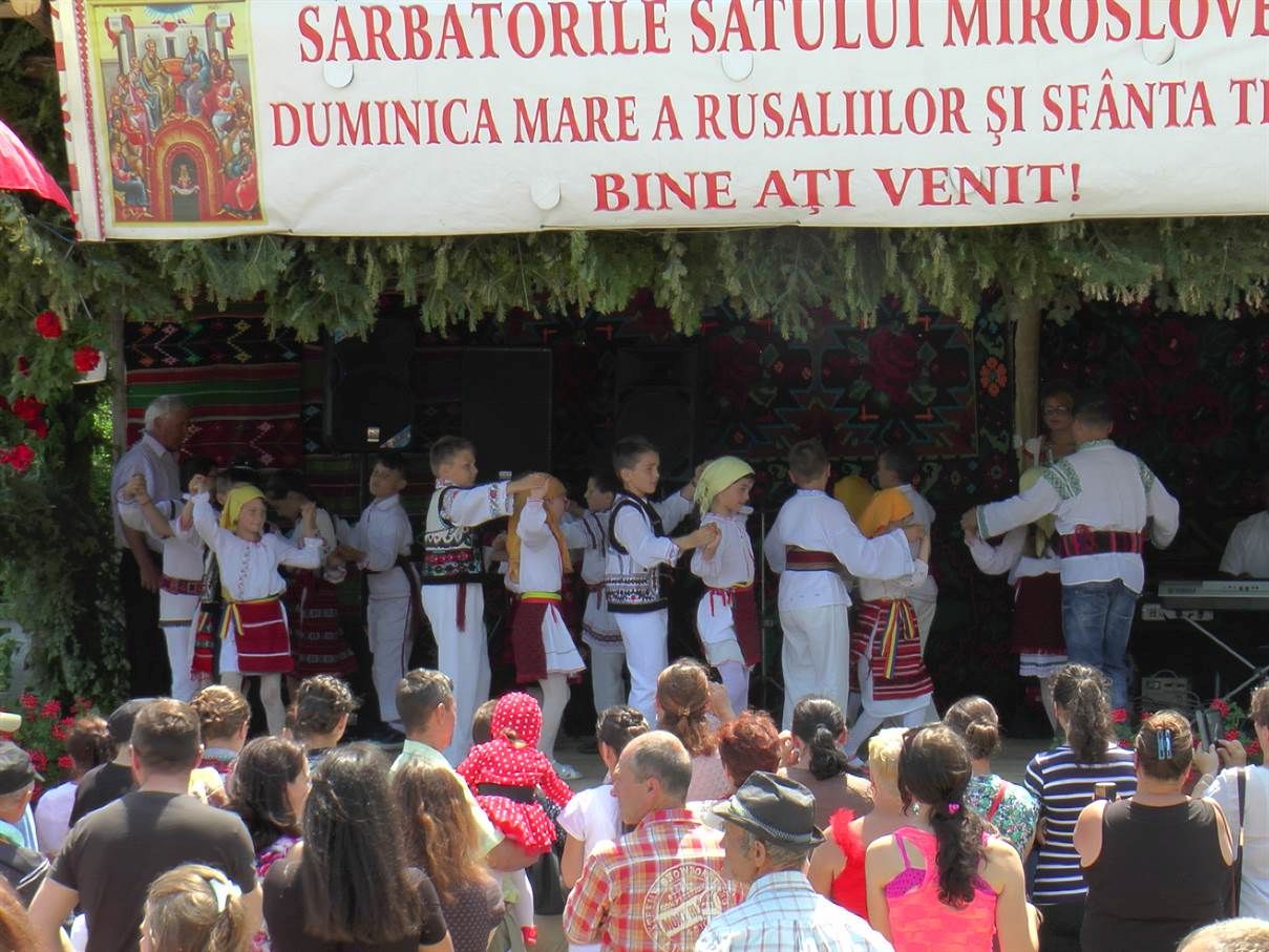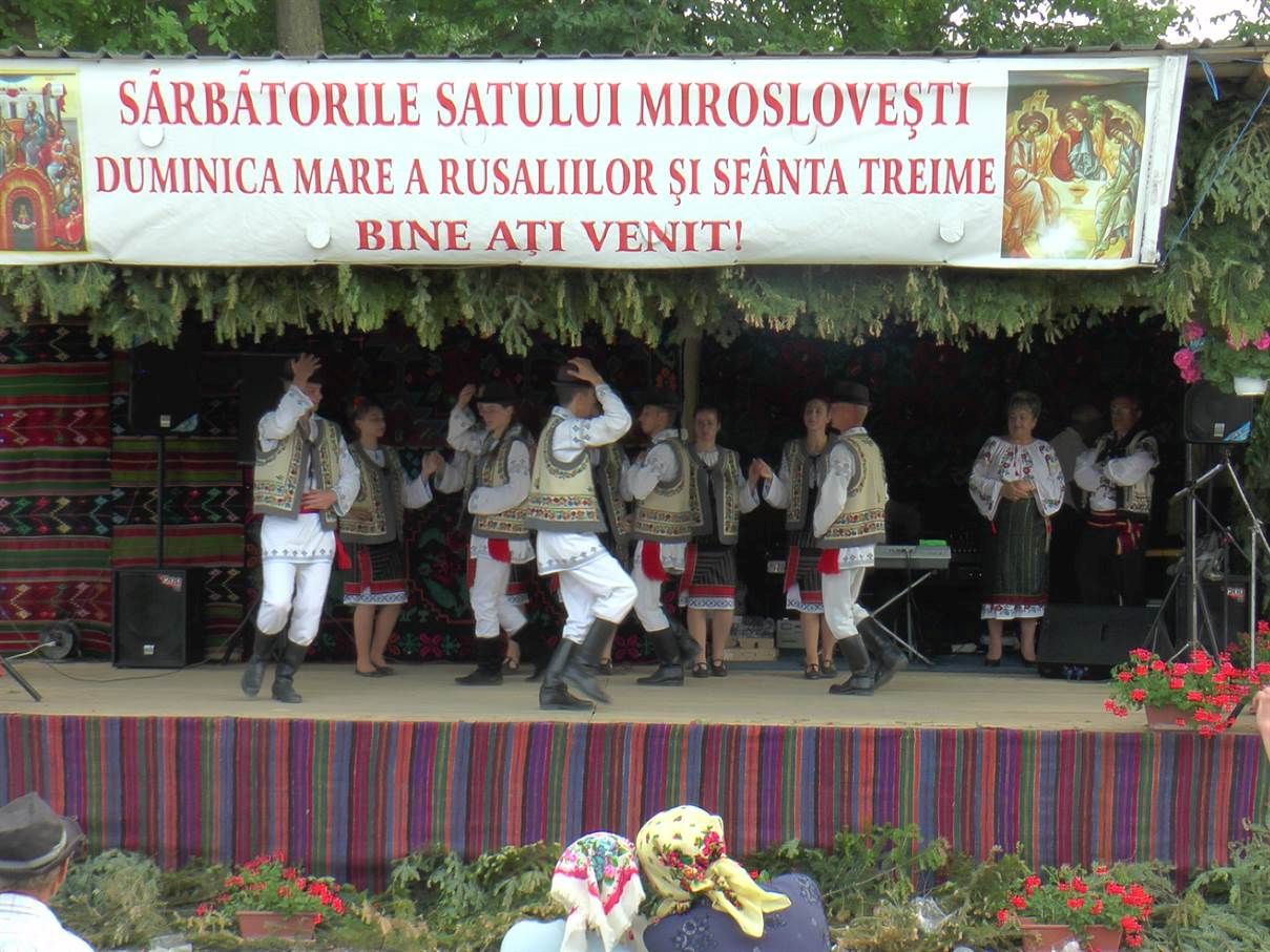 Reamintim că în fiecare an, la 50 de zile de la Înviere, de Rusalii, locuitorii din Miroslovești sărbătoresc zilele comunei şi hramul Bisericii “Sfânta Treime”. Pentru acest eveniment gospodinele pregătesc mâncăruri tradiţionale gustoase, invită rudele la masă, după care ies cu toţii în centrul satului la bâlci.