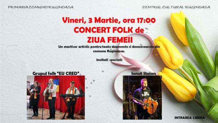 Vineri, 3 martie, intreaga comunitate din Ruginoasa este invitata la un concert de muzica folk, organizat in avans cu ocazia Zilei Internationale a Femeii.