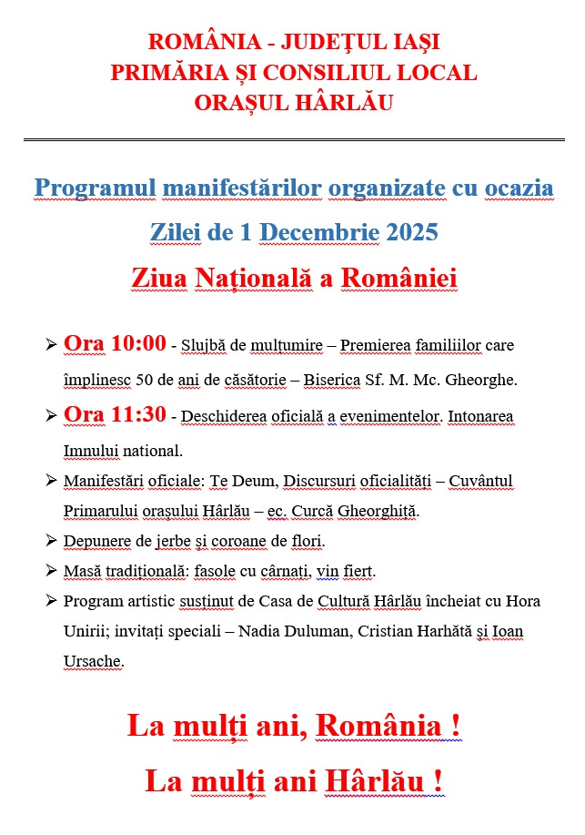 La Hârlău, Ziua Națională va aduce un program plin de evenimente. De la ora 10:00, vor fi premiate 20 de cupluri care au împlinit 50 de ani de la căsătorie, la Biserica Sf. M. Mc. Gheorghe.