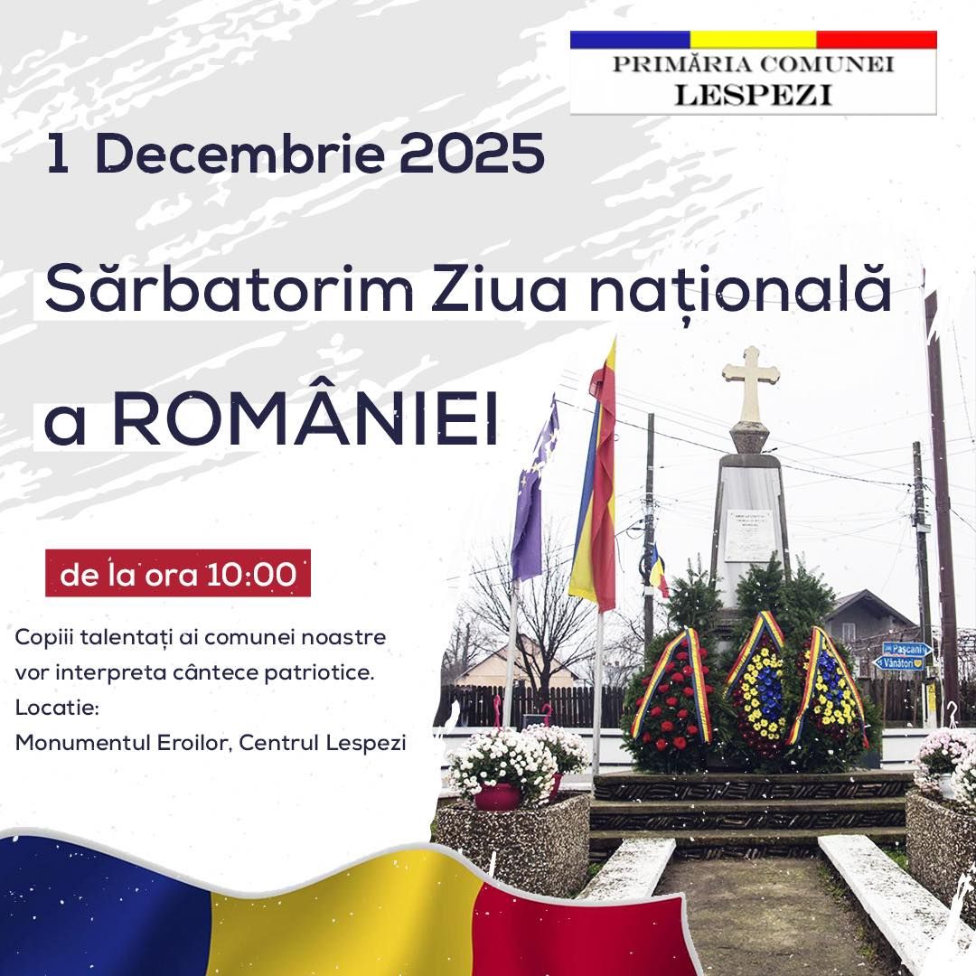 Ziua României va fi sărbătorită așa cum se cuvine și în comuna Lespezi. Primarul, Lucian Marcu, a anunțat comunitatea despre faptul că luni, 1 decembrie, copiii talentați vor susține un program artistic la monumentul eroilor din centrul localității Lespezi.