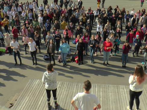 Apoi, cu totii au dansat zumba, coordonati de trei elevi din clasele a XII-a. Dupa miscarea generala, elevii s-au grupat in trei ateliere unde au facut pasi de vals, etno si latino.